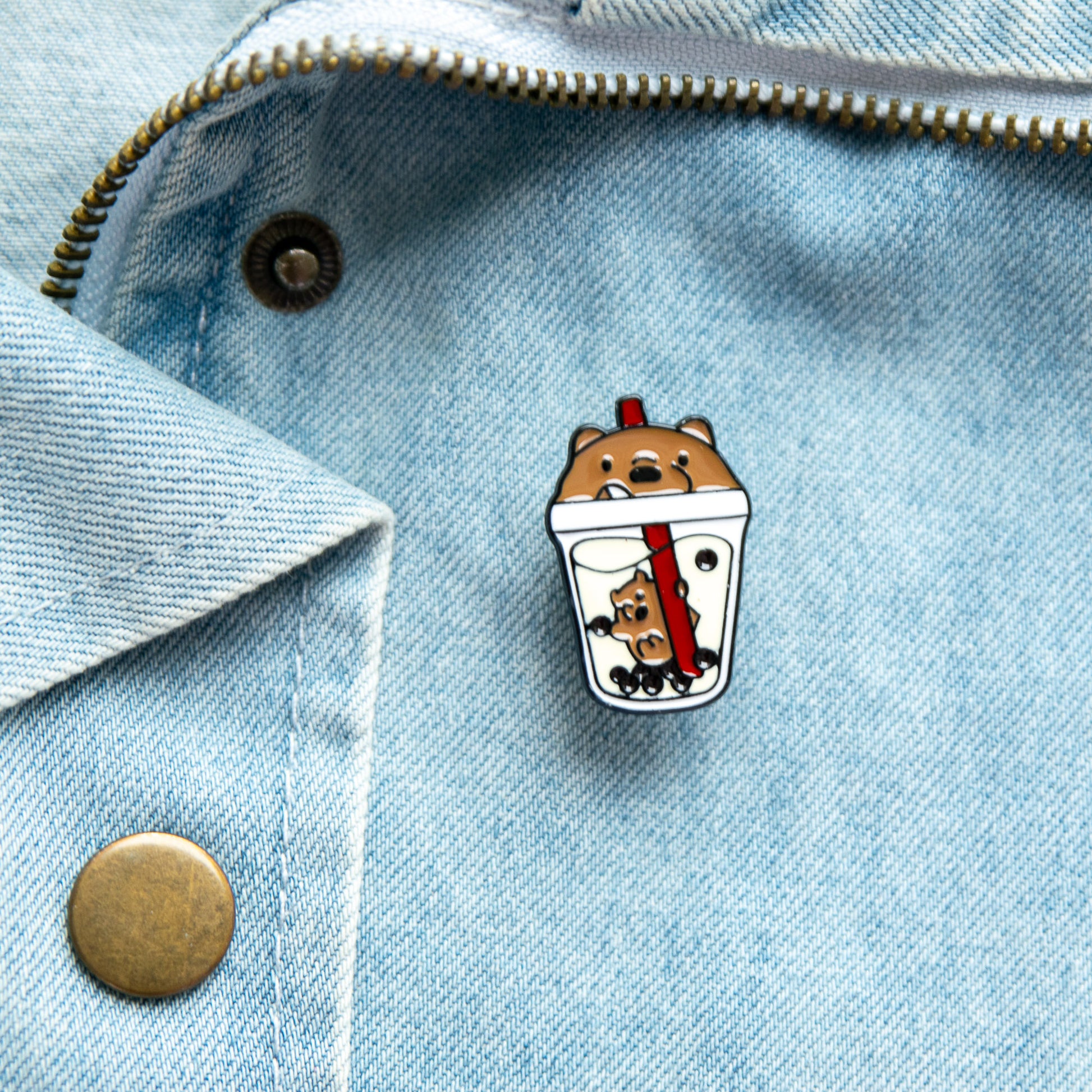 - Un pin’s trop fun : un ours plongé dans un bubble tea rempli de perles